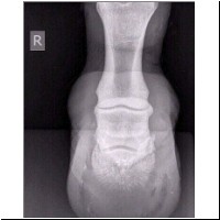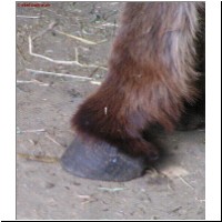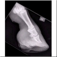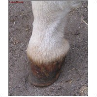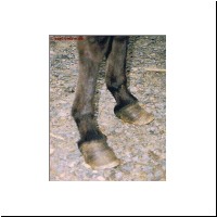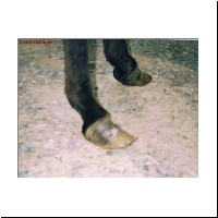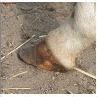 Es sind meist beide Vorderhufe und/oder beide Hinterhufe betroffen, selten ein Huf allein. Die erste Massnahme bei Verdacht einer Rehe ist - den Esel von der Wiese auf weiche Einstreu zu stellen und die Hufe zu kühlen, (Wasserstrahl oder Hufe im Eimer m Wasser) dann sofort den Tierarzt zu benachrichtigen. Darauf hin sollte der Esel eine Futterumstellung auf Diätbasis bekommen. Anschließend, nach einer erfolgten Röntgenaufnahme, sollte der Hufschmied den Huf nach und nach passend zum Fesselstand korrigieren, auch wenn eine Hufbeinrotation oder ähnliches vorliegt. Weiteres siehe hier. Auch bei der Geburtsrehe, die durch ein Nachgeburtsverhalten ausgelöst werden kann, werden Giftstoffe (Toxine) nicht normal abgebaut und verbleiben in der Blutbahn, gelangen somit auch in die Weiße Linie. Dann ist noch die Belastungsrehe zu erwähnen, die durch falsche Korrektur und dadurch falsche und zudem noch hohe Belastung der Hufe entsteht. Dabei kann der Hufstoffwechsel nicht mehr aktiv arbeiten, die Blutzirkulation ist eingeschränkt, eine Ausleitung ist nicht mehr möglich. Die Blutgefäße in den Hufen entzünden sich und es ensteht die Hufrehe. Außer als Rehe können sich die entstandenen Giftstoffe auch als Abszess zeigen. Hufrehe ist bei Wildeseln nicht bekannt. Wildesel durchlaufen bei ihren Wanderungen viele verschiedene Bodenarten, vom weichen Sand über Steine und Berge hin zu Graslandschaften.Wichtig ist also auch für unsere Hausesel, ihnen verschiedene Bodenarten zu bieten, wechselnde Bodenarten. Es sollte nicht nur Sand, nicht nur Beton oder nicht nur Wiese sein. Durch die verschiedenen Bodenarten wird der Stoffwechsel im Huf angeregt, zu dem entsteht dadurch ein natürlicher Abrieb am Huf. Zu guter Letzt eine nicht sehr häufige Erkrankung des Hufes : Hufbeinfraktur (Hufbeinbruch)Eselstute "Peggy" zeigte eine hochgradige Lahmheit des rechten Vorderhufes. Der Huf wurde NICHT genutzt. Die erste Untersuchung zeigte, dass es kein Hufgeschwür, Rehe oder ähnliches war. Darauf hin machte der Tierarzt Röntgenbilder. Zu sehen ist der rechte Voderhuf von der Seite - ohne sichtbare Veränderungen. Der rechte Vorderhuf nach der Behandlung. Die Fraktur ist gut verheilt. Bei der nächsten Hufkorrektur zeigte sich das Ablösen der Hornsohle. Darunter hatte sich bereits eine neue Sohle gebildet. Durch die Hufbeinfraktur konnte der Hufmechanismus nicht arbeiten und die Sohle wurde in der Zeit minder versorgt. Das zeigt, wie wichtig es ist, den Hufen stets den korrekten Stand zu geben. Jede unfachmännische Korrektur kann zu Schäden im Gelenk und Störungen im Huf bzw Hufstoffwechsel führen. |