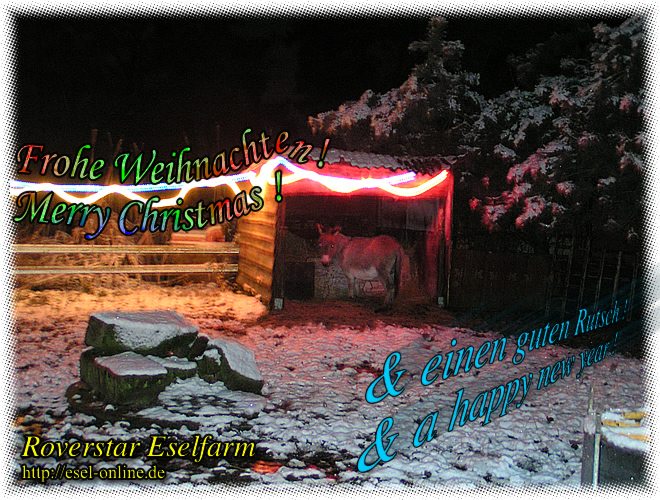03.06.2013 Inzwischen sind 2 weitere amerikanischen Minieselfohlen auf der RoverStar Eselfarm geboren. RoverStar Yasmin RoverStar Yogi 09.05.2013 Amerikanischer Miniesel-Zucht-Hengst zu verkaufen. 24.04.2013 Die ersten 2 amerikanischen Minieselfohlen sind geboren. RoverStar Shakira RoverStar Marena 24.12.2012 29.05.2012 Die Verkaufsseite ist aktualisiert. Es ist ein knuddeliges Minieselmädchen-Paar. 30.04.2012